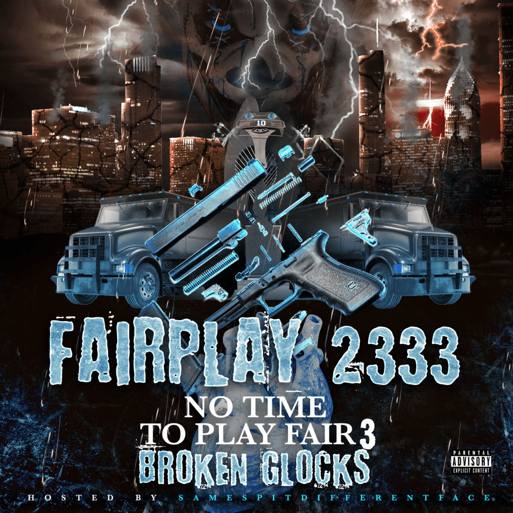Chicago multi talented artist Fairplay 2333 releases his third installment in his “No Time To Play Fair” mixtape series hosted by Same Spit Different Face Podcast. “No Time To Play Fair 3: Broken Glocks” is a ten track mixtape that includes freestyle over some of the hottest records in the HipHop industry. It features records such as “Statements”, “Get Your Roll On” featuring Leek Muney and “House Arrest Tingz”. It also includes a feature from TFE Cash on “Steppers” along with Leek Muney.